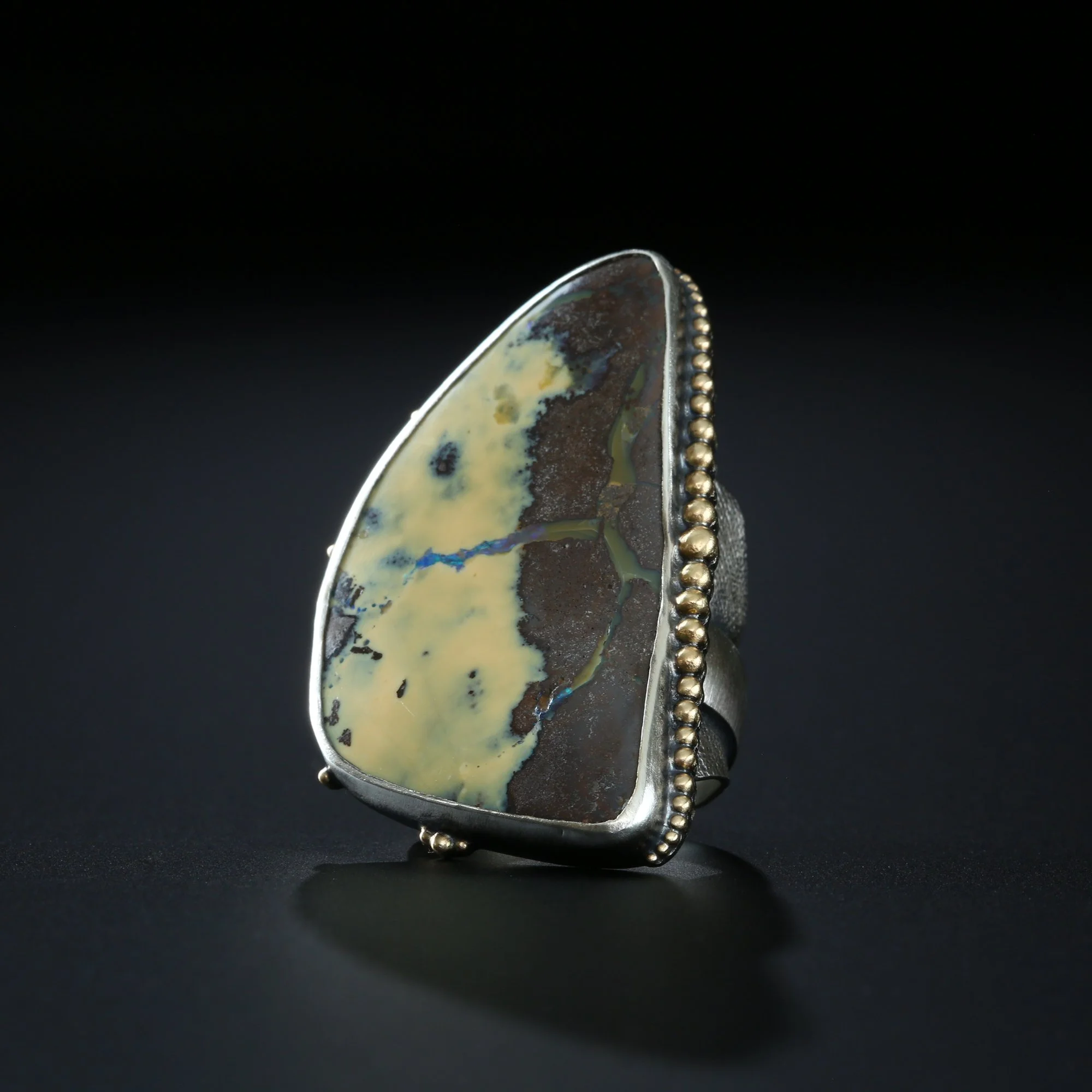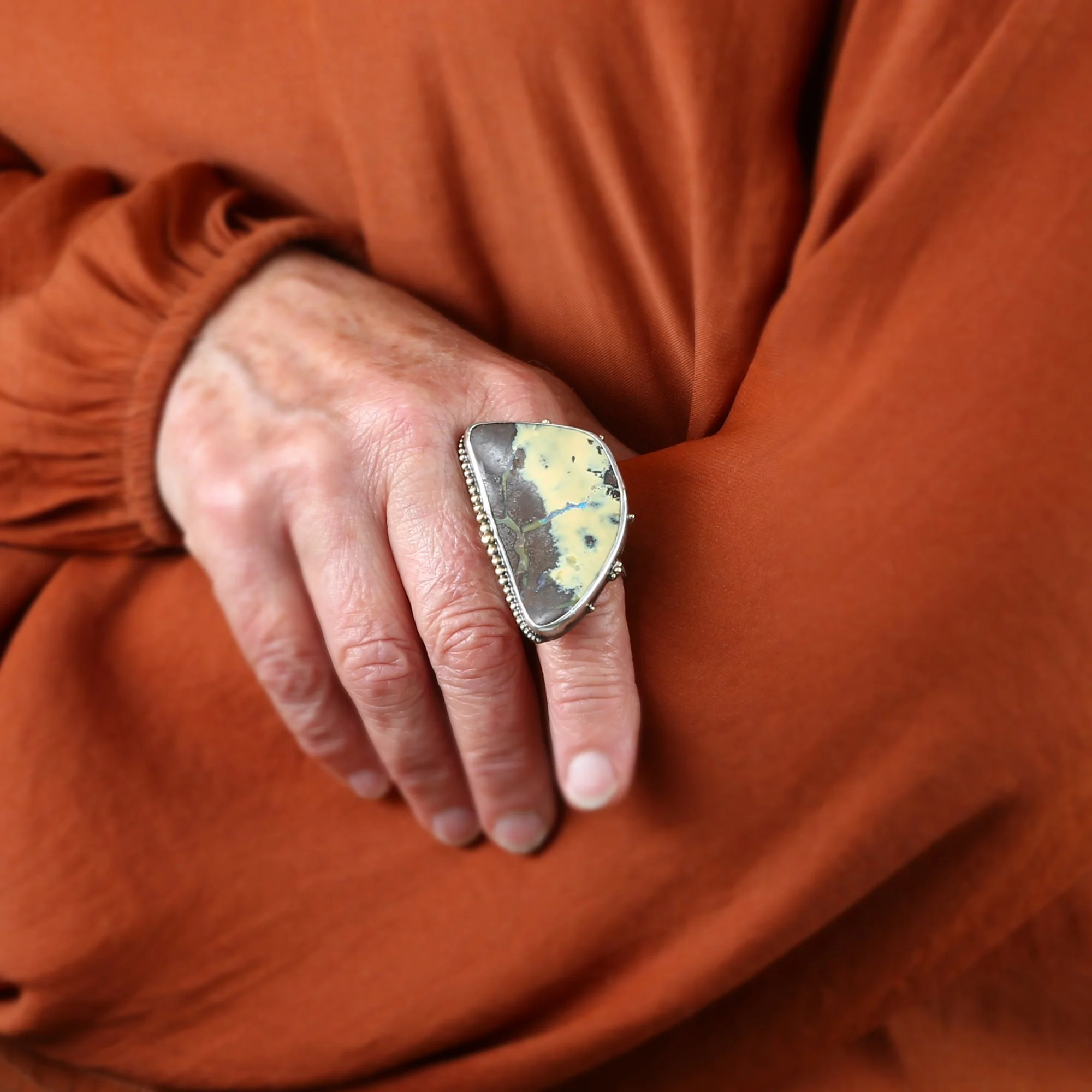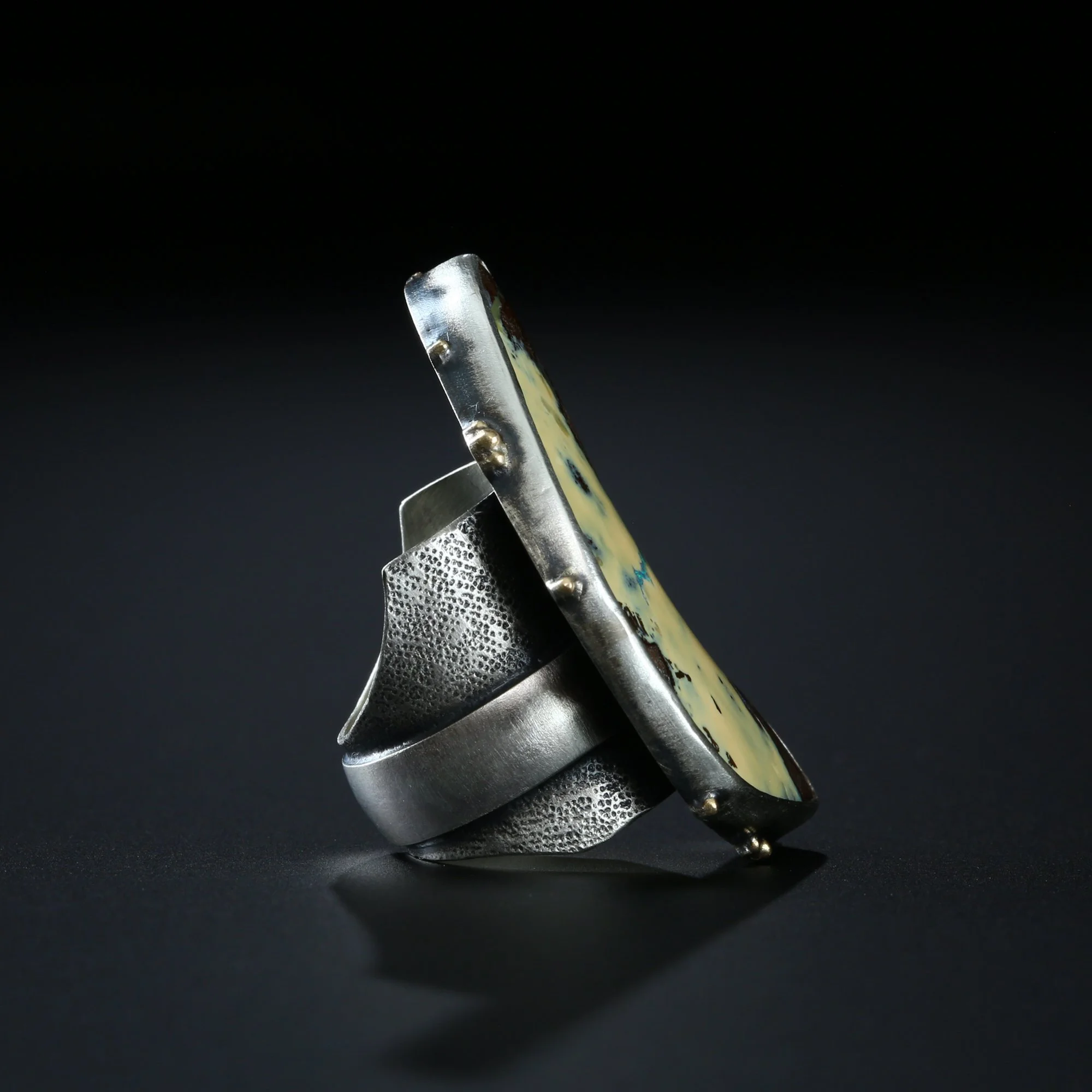 Our rings are fabricated one-of-a-kind creations. Each stone is carefully chosen and almost always totally unique. Using mainly sterling silver and 18k gold, we forge, form, saw, and solder all parts.